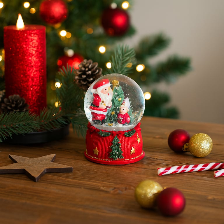 ENFEITE NATAL 6,5X4,5 CM GLOBO DE NEVE PAPAI NOEL E ÁRVORE COM CRIANÇA