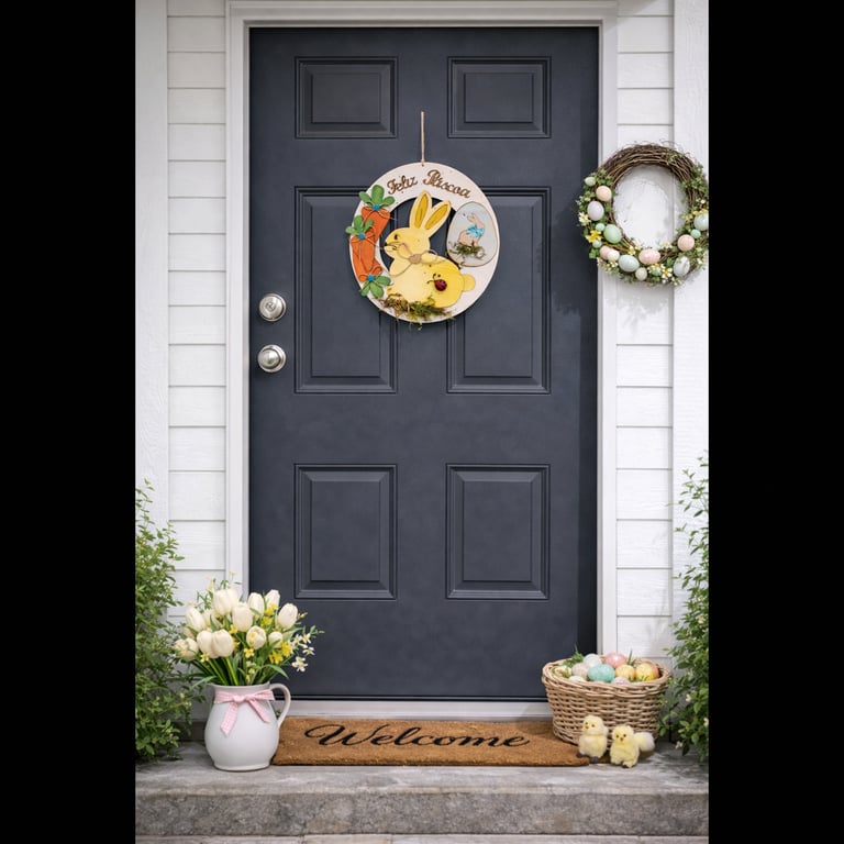 ENFEITE PORTA / GUIRLANDA FELIZ PÁSCOA 30 CM COELHO COM CENOURA / OVOS MDF