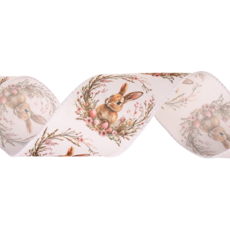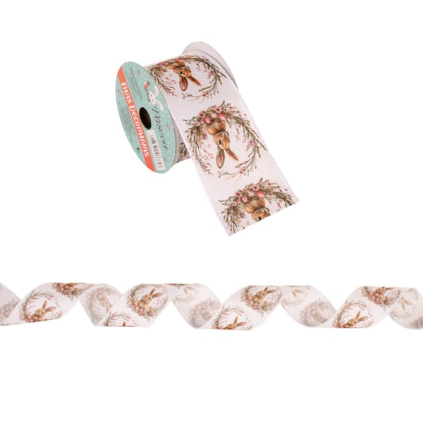FITA TECIDO ARAMADA 6,3 CMX9,1 M PÁSCOA BRANCA COELHOS NA GUIRLANDA