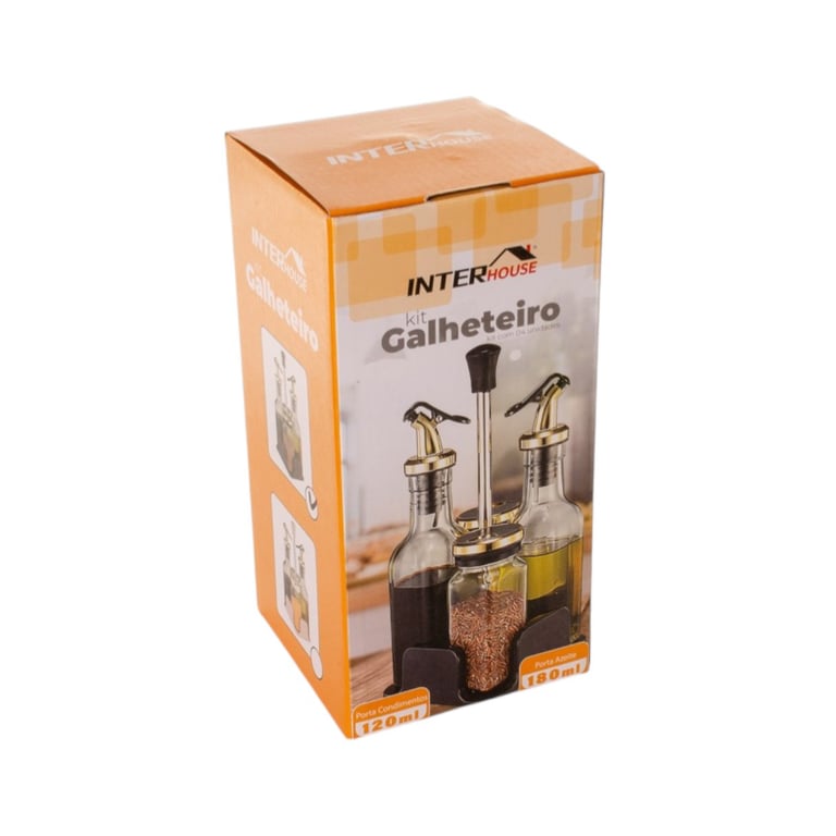 Mais medidas PORTA CONDIMENTOS:11X4,5 CM(120 ML) PORTA VINAGRE/AZEITE:20X5 CM(180 ML) CAIXA:27X14 CM
