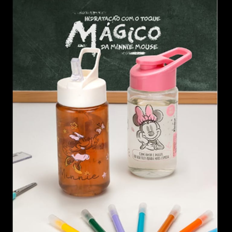 GARRAFA SQUEEZE 500 ML MINNIE COM CANUDO E ALÇA PLÁSTICA