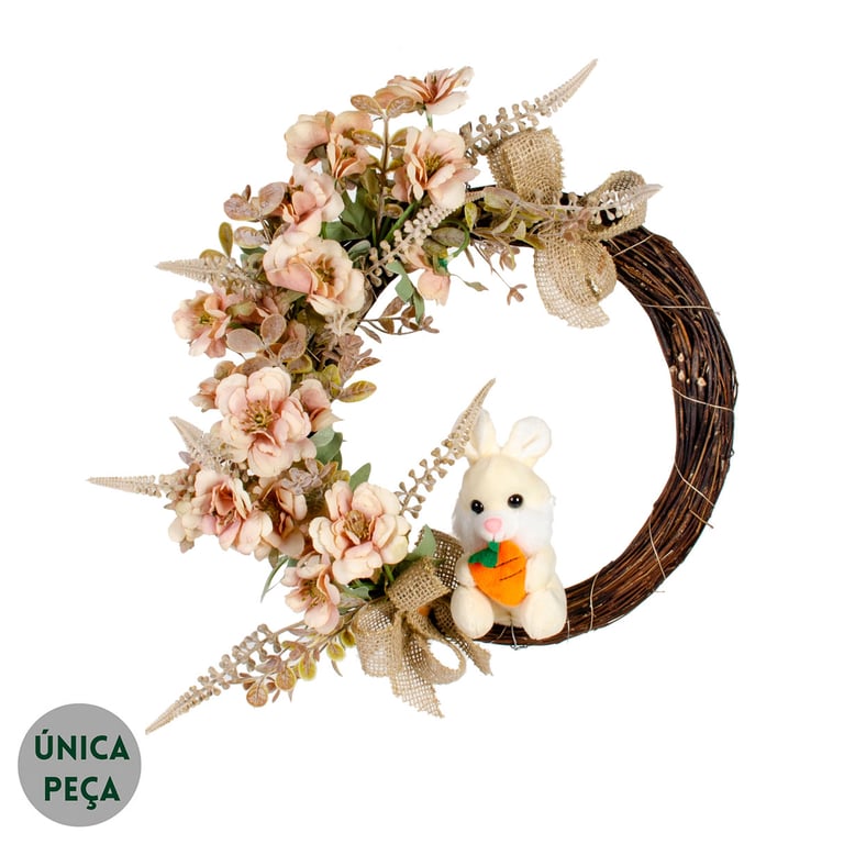 GUIRLANDA DE PÁSCOA 38 CM COM COELHO LAÇOS FLOR DO CAMPO E LAVANDA