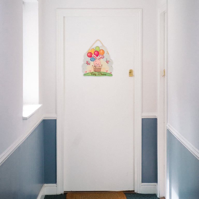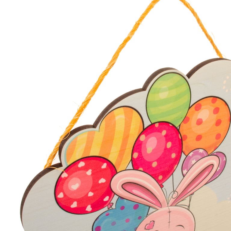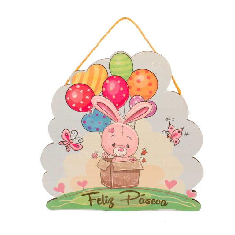 ENFEITE PORTA FELIZ PÁSCOA 34X29 CM COELHO COM BALÕES NA CAIXA