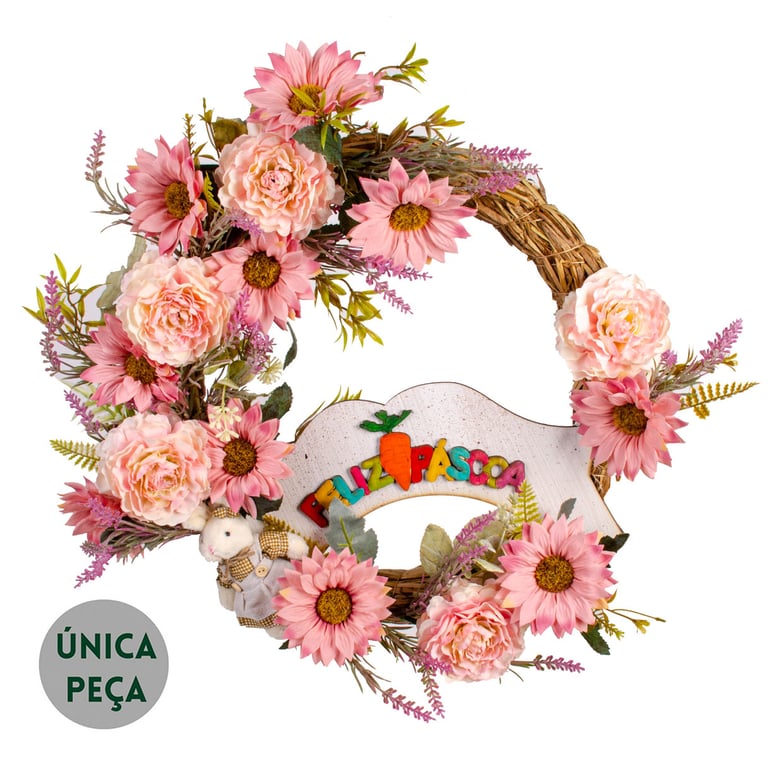 GUIRLANDA FELIZ PÁSCOA 46 CM GÉRBERA DÁLIA E COELHO