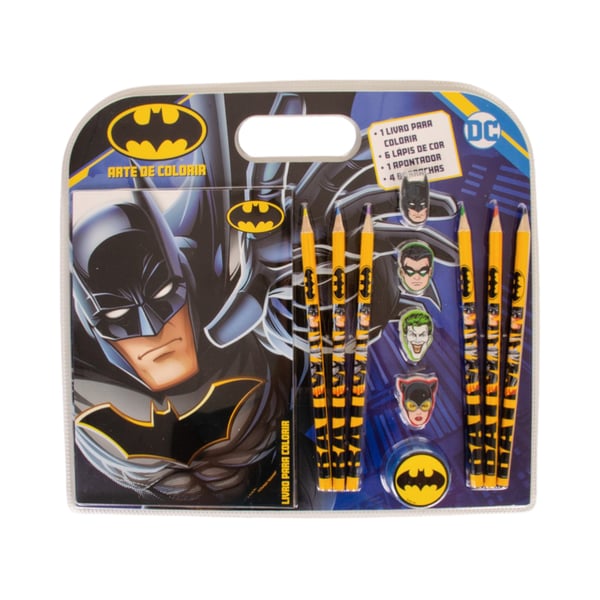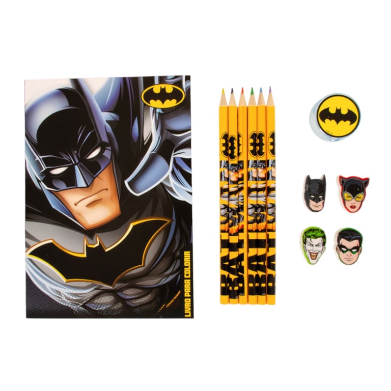 LIVRO ATIVIDADES 28X30 CM MALETA BATMAN COM LÁPIS BORRACHAS E APONTADOR 8 PÁGINAS