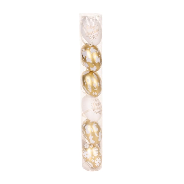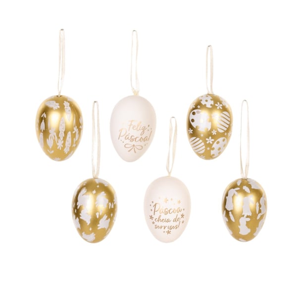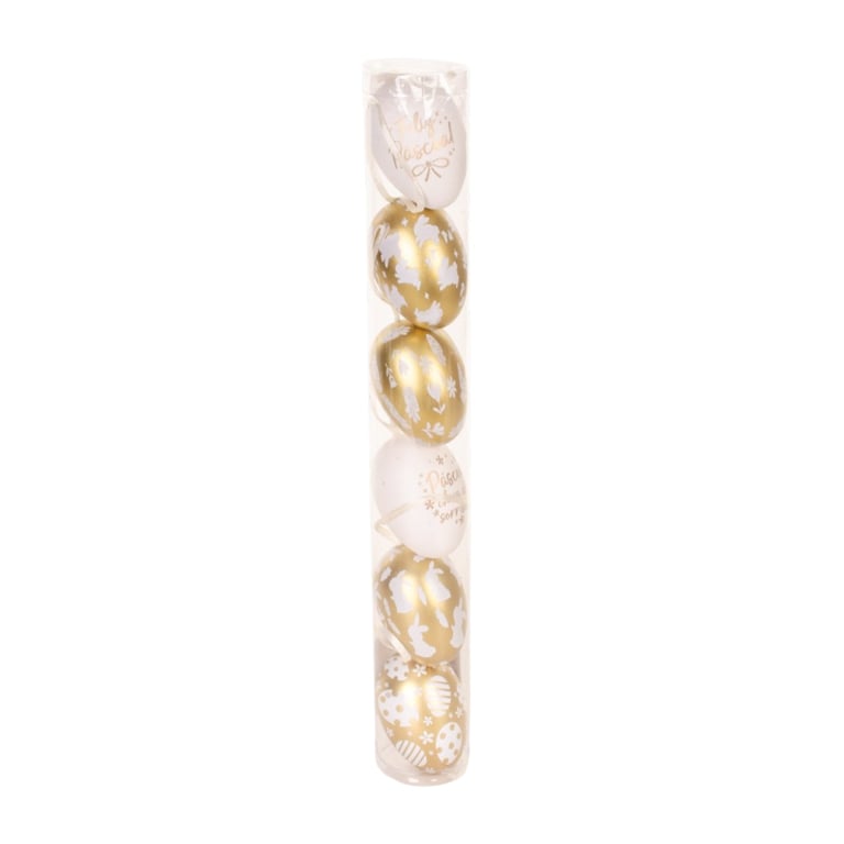 OVO PLÁSTICO 6 CM 6 PEÇAS DOURADO / BRANCO DECORADO NO TUBO