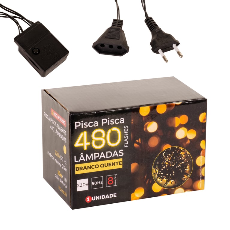 PISCA 480 LEDS BRANCO QUENTE COM FLASH / STROBO 8 F 10 M FIO PRETO 220V