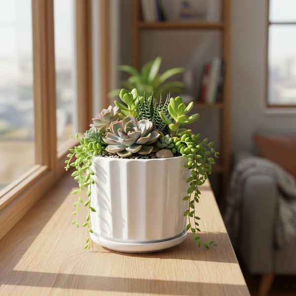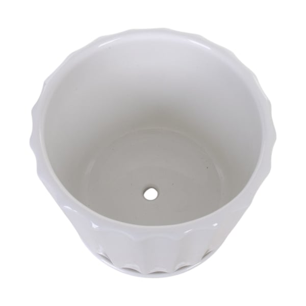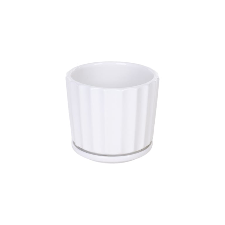 VASO / CACHEPÔ CERÂMICA POTE 12 13,5X14 CM CANELADO COM PRATO BRANCO